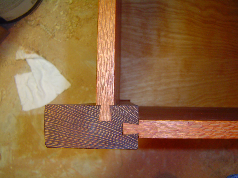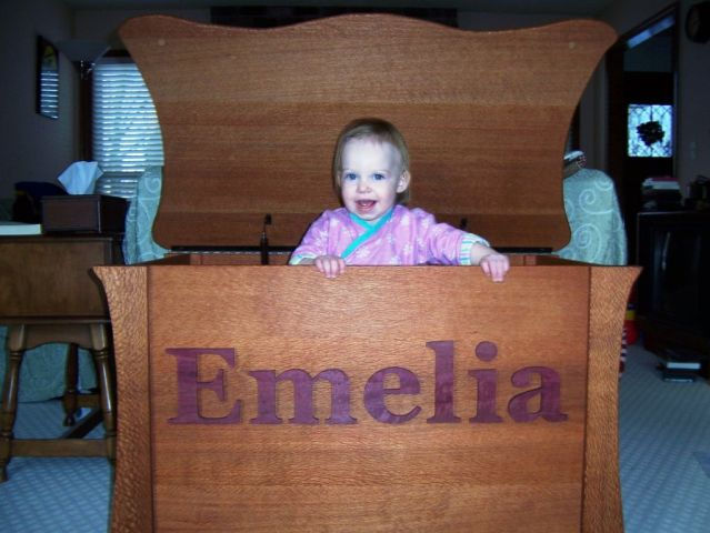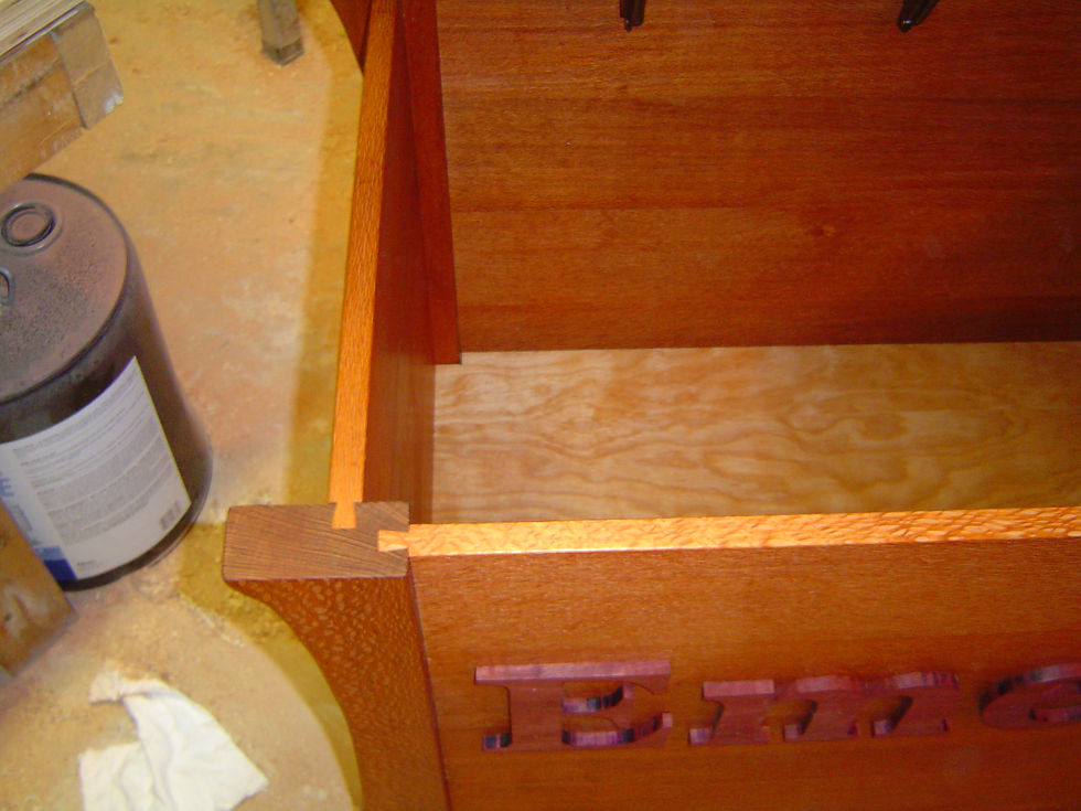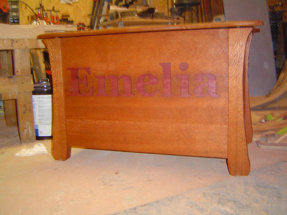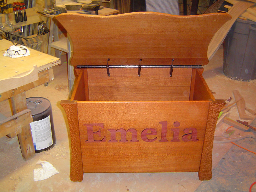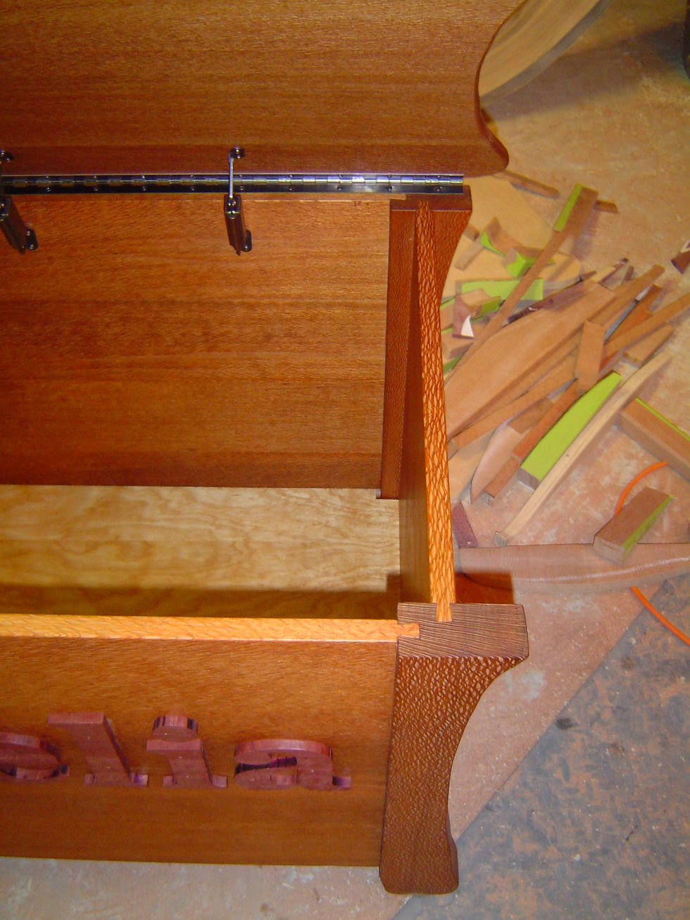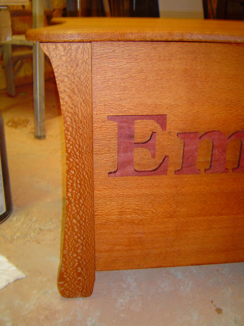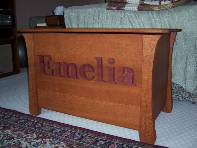 The cabinet is made from lacewood and the letters are cut out of purpleheart. The joinery is sliding dovetails. Toy box lid supports prevent the lid from smashing fingers.