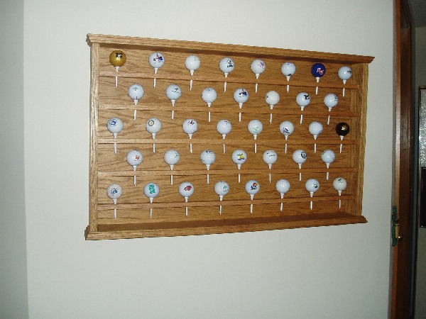 White oak, made it for my dad's birthday. It hangs on the wall in his basement and displays logos of many of the courses he has mastered.